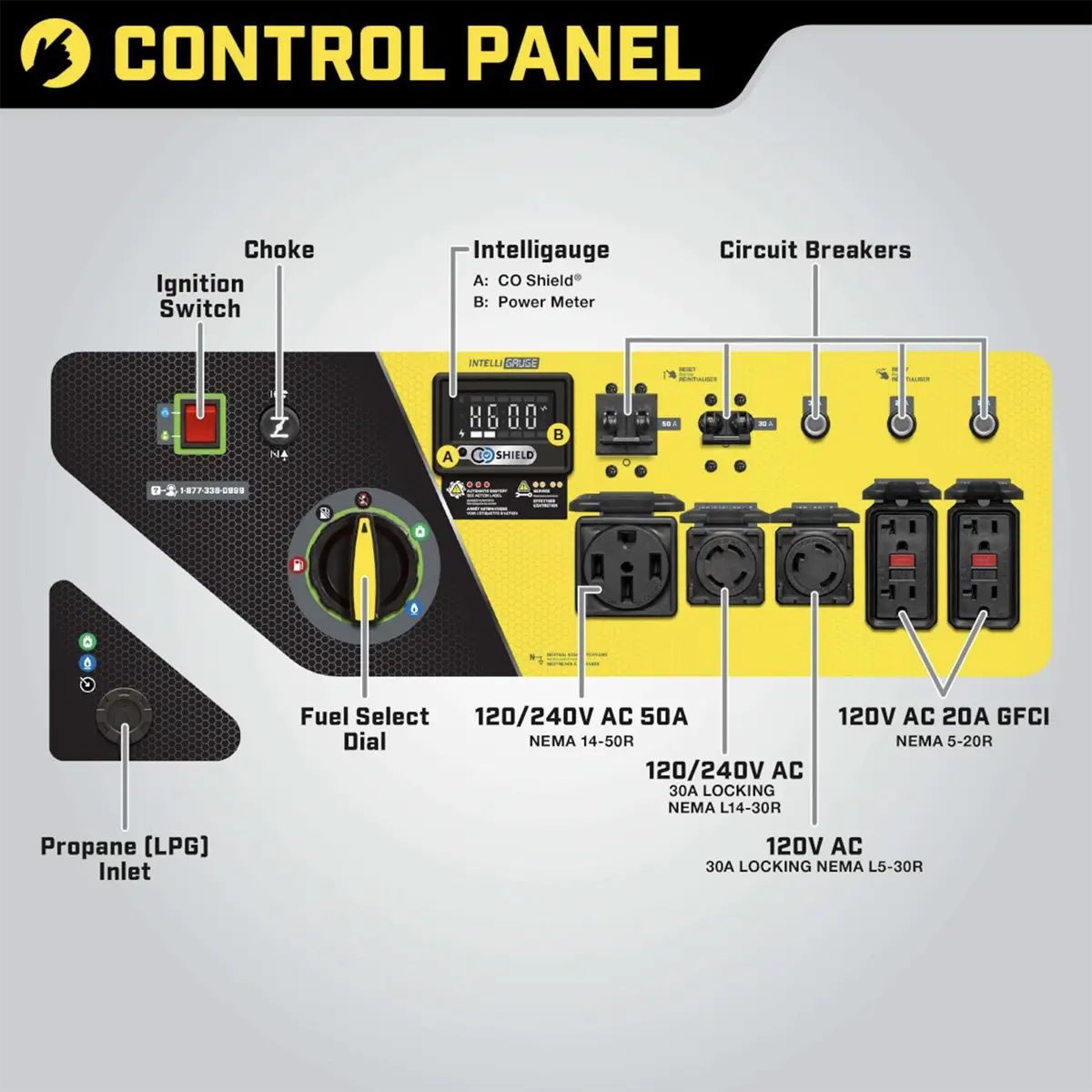- Intelligauge Digital Display: Real-time monitoring of voltage, frequency, run time, and power output.