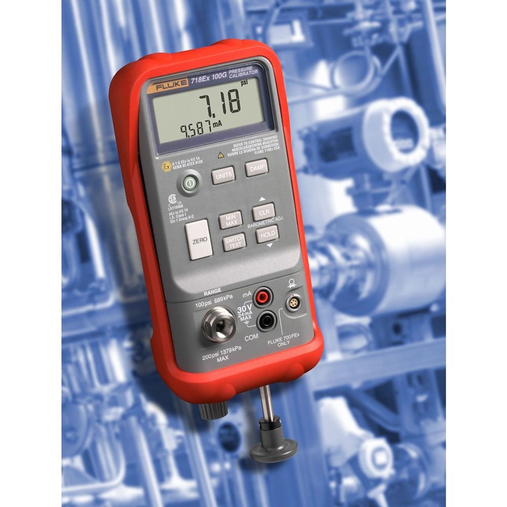 Fluke 718EX Intrinsically Safe Pressure Calibrator is an intrinsically safe pressure calibrator with a listed pressure range of 300PSIG. It is intended for pressure calibration work together with the functions listed in the source data.