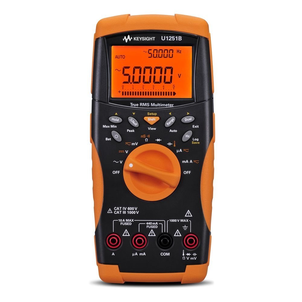 Keysight Technologies U1251B Multimeter is a multimeter for electrical measurement and troubleshooting. Source details include 50,000 counts resolution on dual display and 0.03% basic DC voltage accuracy.